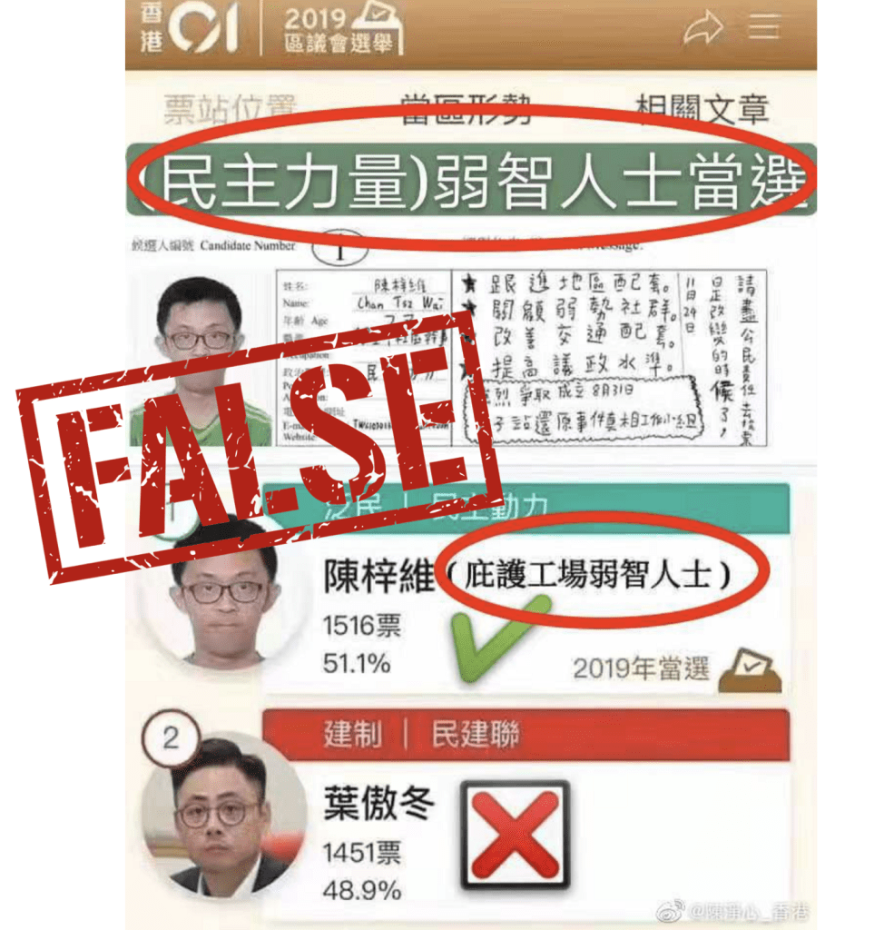 Since the stunning landslide victory by the pro-democracy camp in the district council elections Sunday, an unsubstantiated claim that one of the newly elected politicians is “mentally challenged” has been shared on multiple platforms.