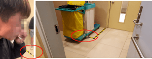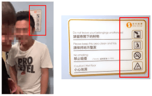 The sign in the video matches the door signage. The ceiling light, barricade tape on the floor, placement of handrails, rubbish bin, emergency buttons, and other identifiable features of the place match exactly.