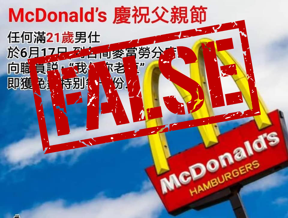 It claimed men over the age of 21 who say “I am your father” on Father’s Day at McDonald’s were entitled to a free meal. Local newspaper the Oriental Daily debunked the rumor.