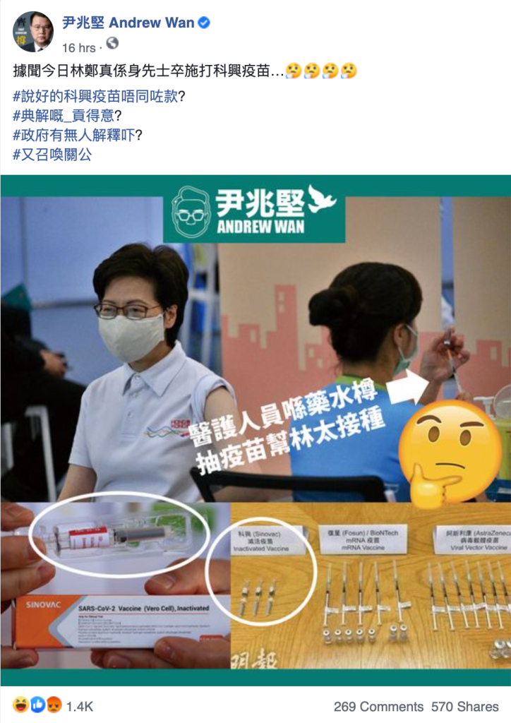 在 Facebook 上發文的包括民主黨立法會前議員尹兆堅。他圈出資料圖片中較短身的科興疫苗預充式針筒,暗示醫護人員手中的針筒較長和身,和另外兩款疫苗的針筒更為相似。
