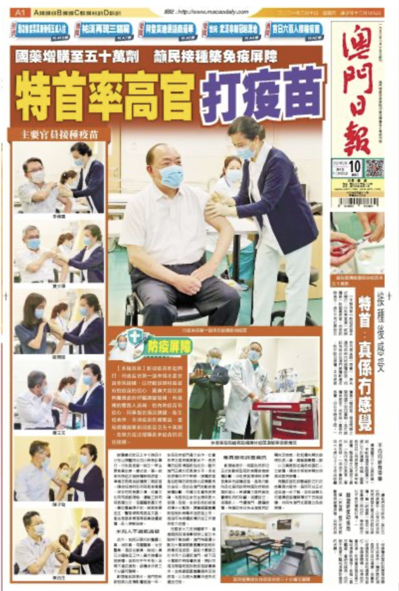 然而這一說法也是錯誤的。據澳門政府 新聞稿 和新聞 報道 ,賀一誠所注射的並不是科興疫苗,而是由另一家中國製藥公司國藥集團生產的疫苗。