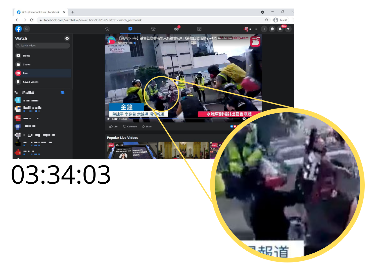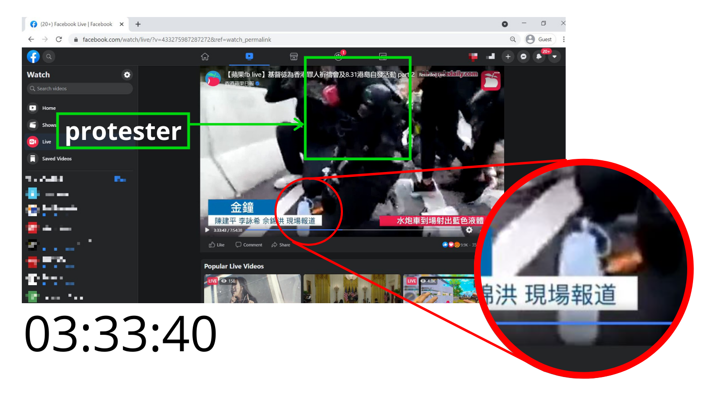 A livestream of the Aug. 31, 2019 protest from Apple Daily HK has also captured the protester with the air gun starting at 03:33:40.