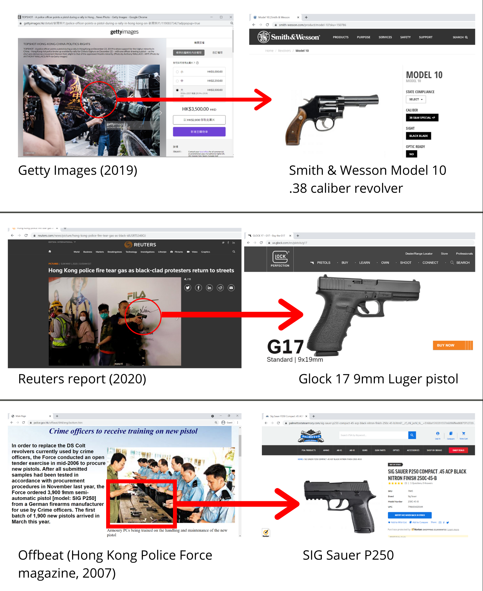 An article from the Hong Kong Police Force’s magazine in 2007 and photos in 2019 show them using different kinds of firearms: the Smith & Wesson Model 10 .38 caliber revolver, the Glock 17 9 mm Luger pistol and the SIG Sauer P250.