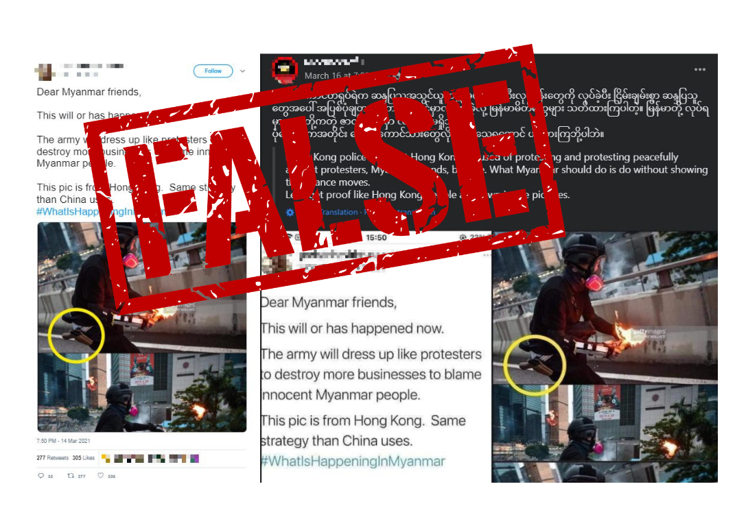 On March 16, a Facebook post claimed in Burmese that using undercover police officers dressed as protesters was a tactic adopted by China during the 2019 anti-government protests in Hong Kong and it could be happening in Myanmar, too.