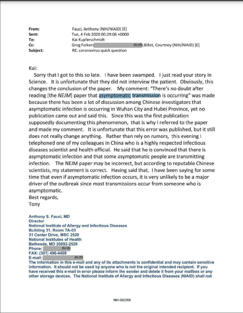 In an email dated Feb. 4, 2020, for instance, Fauci made a comment for a story in Science Magazine, stating he had no doubt that asymptomatic transmissions were occurring.