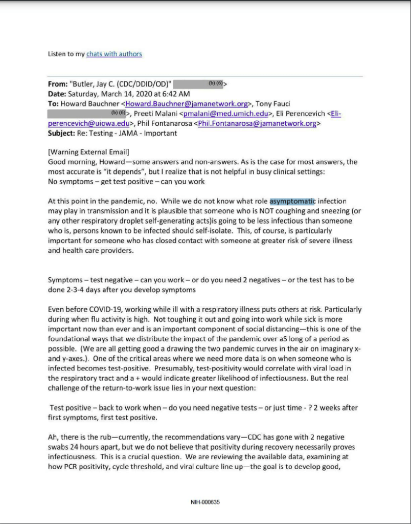 There is also another email dated March 1, 2020, in which Fauci wrote “People can transmit even when they are asymptomatic.”