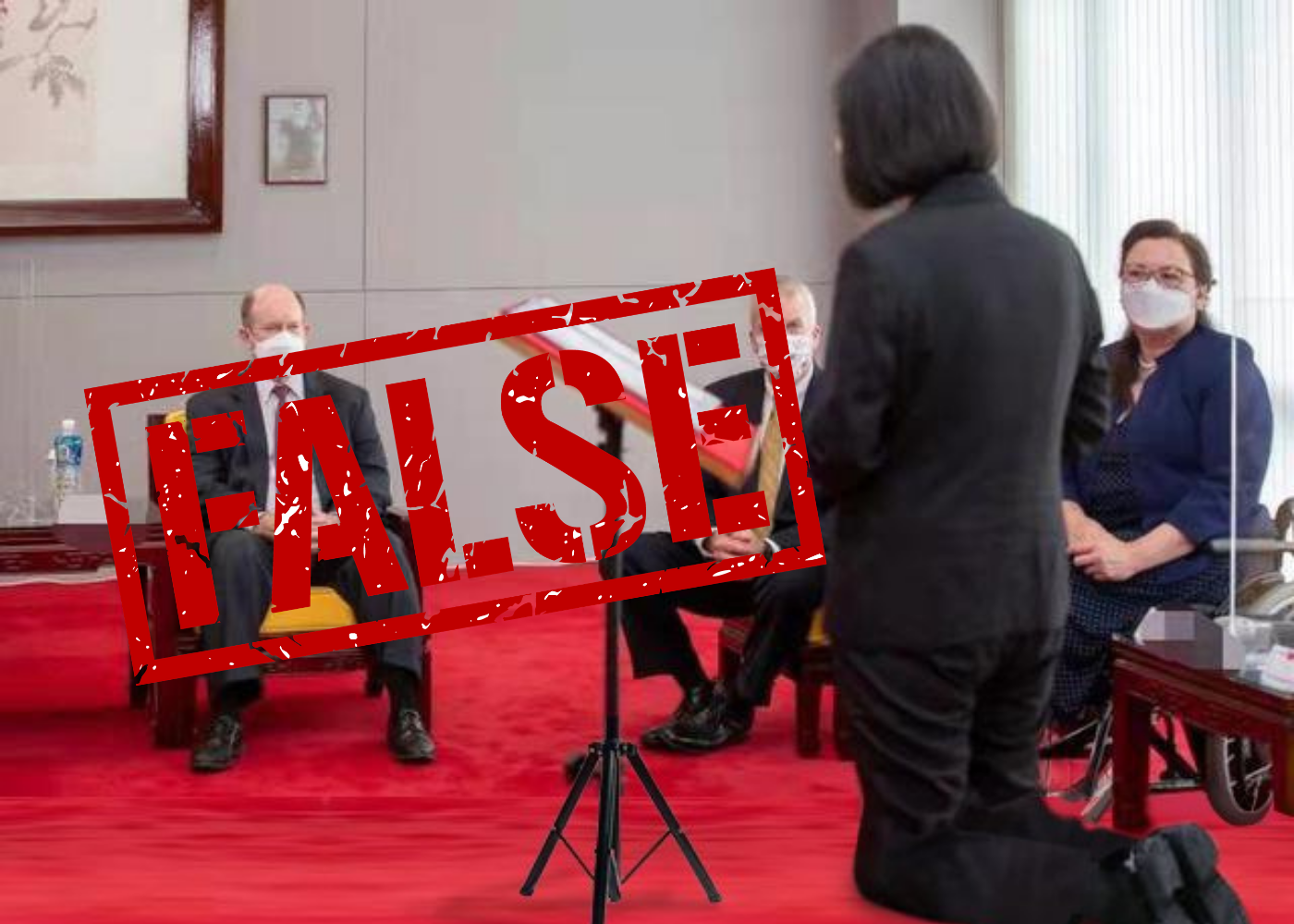 False: This photo is altered. Taiwan President Tsai Ing-wen did not kneel before US senators