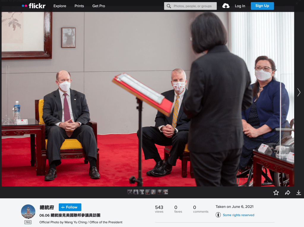 According to its caption, the original photo was released by the Taiwan Presidential Office and shows Tsai meeting U.S. senators Tammy Duckworth, Dan Sullivan and Chris Coons on June 6.