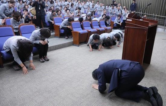 Annie Lab identified a matching photo of the legs in a news photo taken in 2017 in South Korea when then the secretary-general of the National Assembly, Woo Yun-geun, kneeled to pay respect to the cleaners.