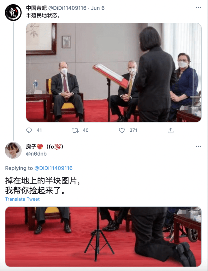 在6月7日,Twitter一篇帖文的圖片指台灣的蔡英文總統向3名美國參議員下跪。這篇帖子在Twitter獲轉發20多次、有200多個讚好。另外亦可找到其他附有相同圖片的帖子,例如這裏和這裏。