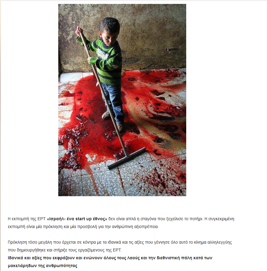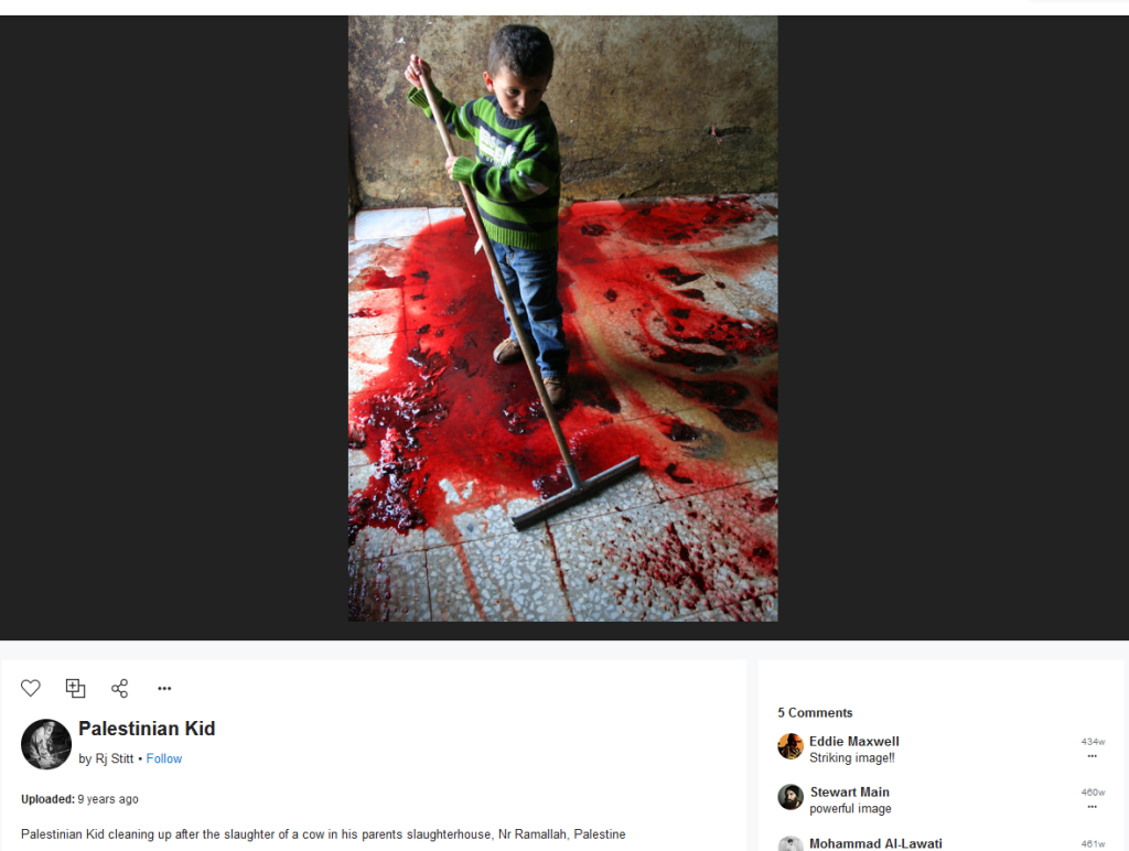 Another posting of this photo titled “Palestinian Kid” in 2011 has a different background story, however. It says the image depicts a Palestinian kid “cleaning up after the slaughter of a cow in his parents’ slaughterhouse, Nr Ramallah, Palestine.”