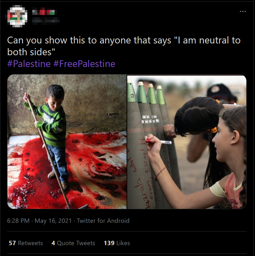 It was posted amidst the Palestine-Israel conflict in the same month but provided no other details.