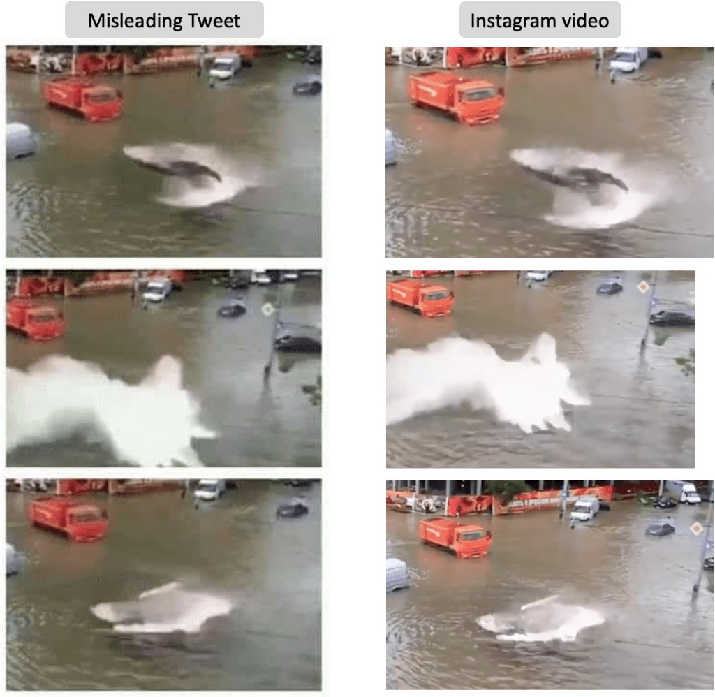 We made a comparison video of the YouTube clip showing the flooded streets (left) and the edited Instagram video (right). The original video does not show a whale.