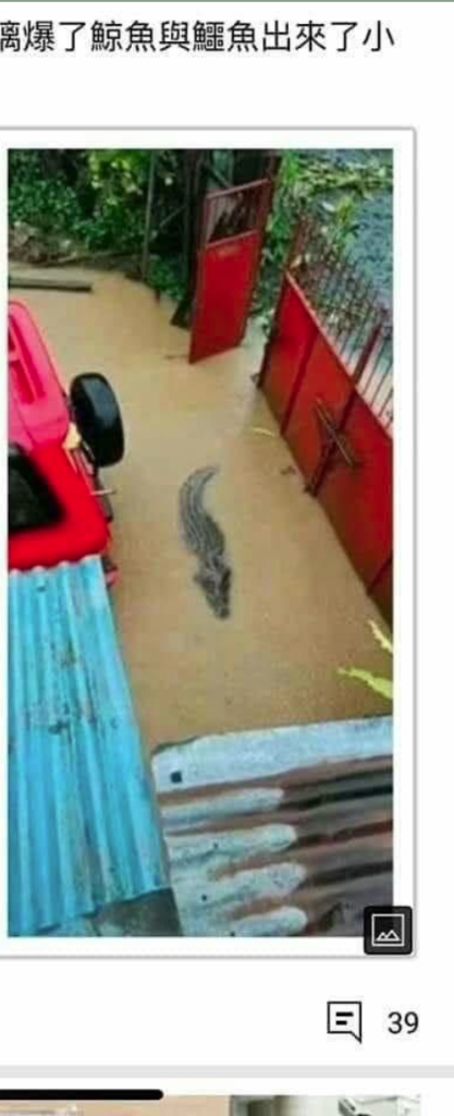 The post contained two images of crocodiles – one holding a woman’s body in its mouth and one inside an area with shallow floodwaters. A collage of three images in the same post, meanwhile, showed what appears to be a whale jumping out of the water.