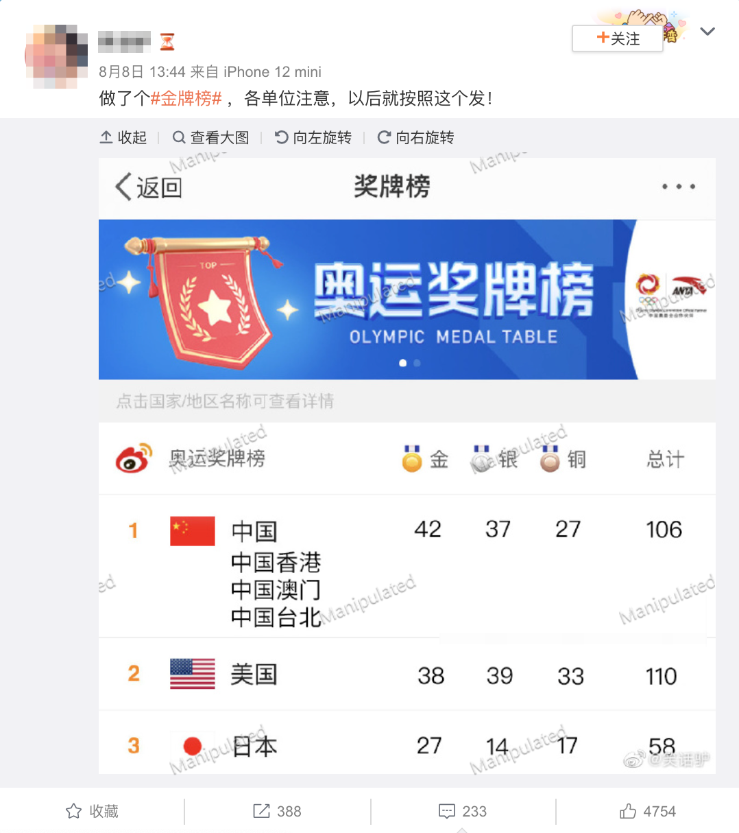With reverse image search and keyword search, the earliest appearance of the misleading table Annie Lab could find was from a user-generated post on Weibo that reads, “Created a gold medal table. Attention everyone. Share this one from now on! (做了个#金牌榜# ,各单位注意,以后就按照这个发! )”