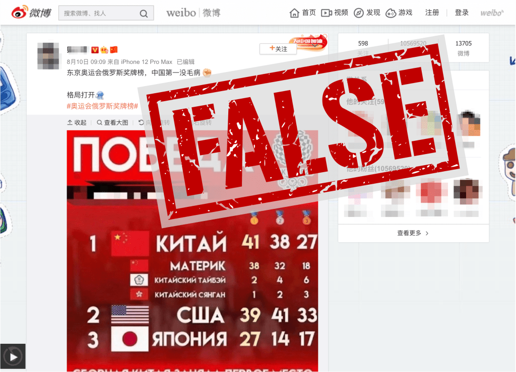 A user on VK, a Russian social media platform, has posted a similar medal table in Russian showing China topping the table with 41 golds together with Hong Kong and Chinese Taipei. This image was included in a viral post on Weibo later on, gaining more than 20,000 likes and nearly 4,500 shares.