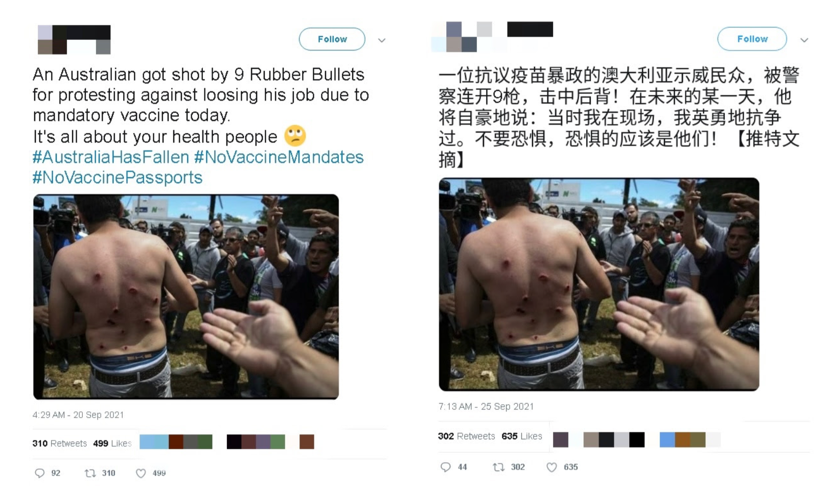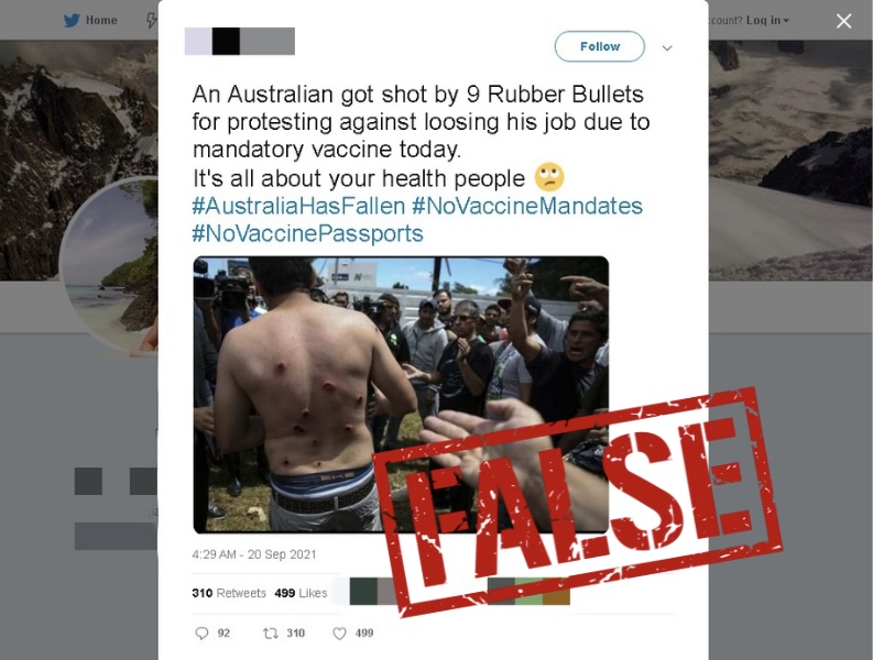 On Sept. 20, a post on Twitter claimed an Australian protester was shot nine times with rubber bullets — with a photo showing the back of a man with visibly disturbing wounds. It suggested he is against mandatory vaccination and lost his job due to that.