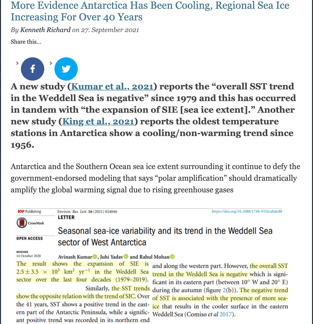 On Sept. 27, for example, an article claimed two new studies have shown Antarctica cooling and sea ice extent increased for over 40 years.