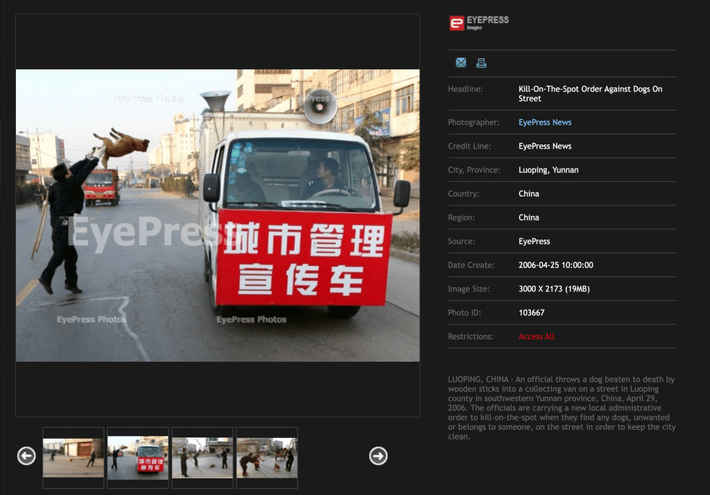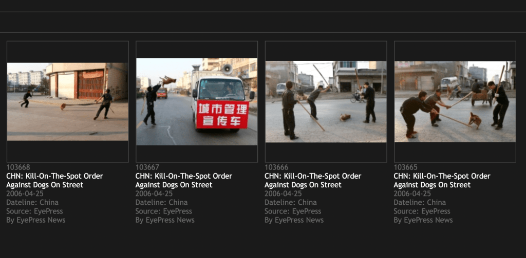 Several English-language news outlets such as the New York Times and The Guardian also reported on the dog cull in China in 2006 with the same photo.