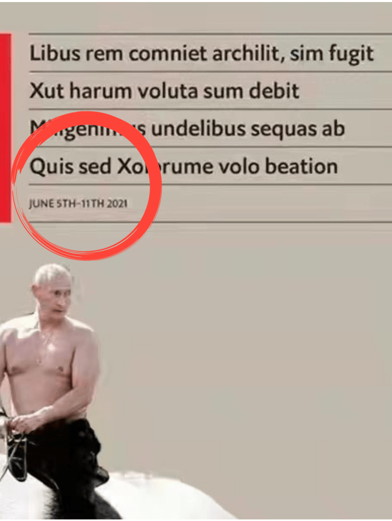 Another indication that the image is a mock-up is the Latin words used as a placeholder for article titles in the magazine.