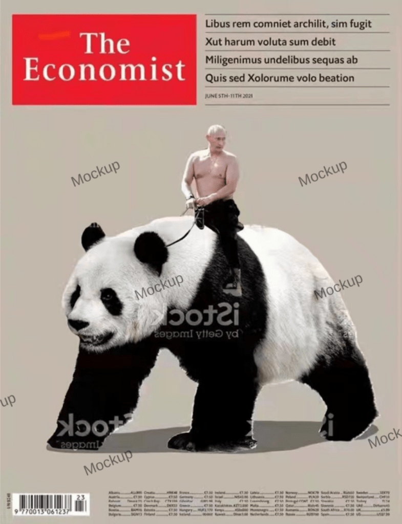 The Economist’s mock-up shows the watermark “iStock by Getty Image” in reverse, indicating the panda image has been flipped horizontally, presumably to match with the direction Putin’s horse was walking in the original photo.