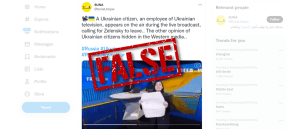 A tweet on March 17 claims to show a Ukrainian woman interrupting a live news broadcast calling on Ukrainian President Volodymyr Zelenskyy to resign and return to his former career as an entertainer.