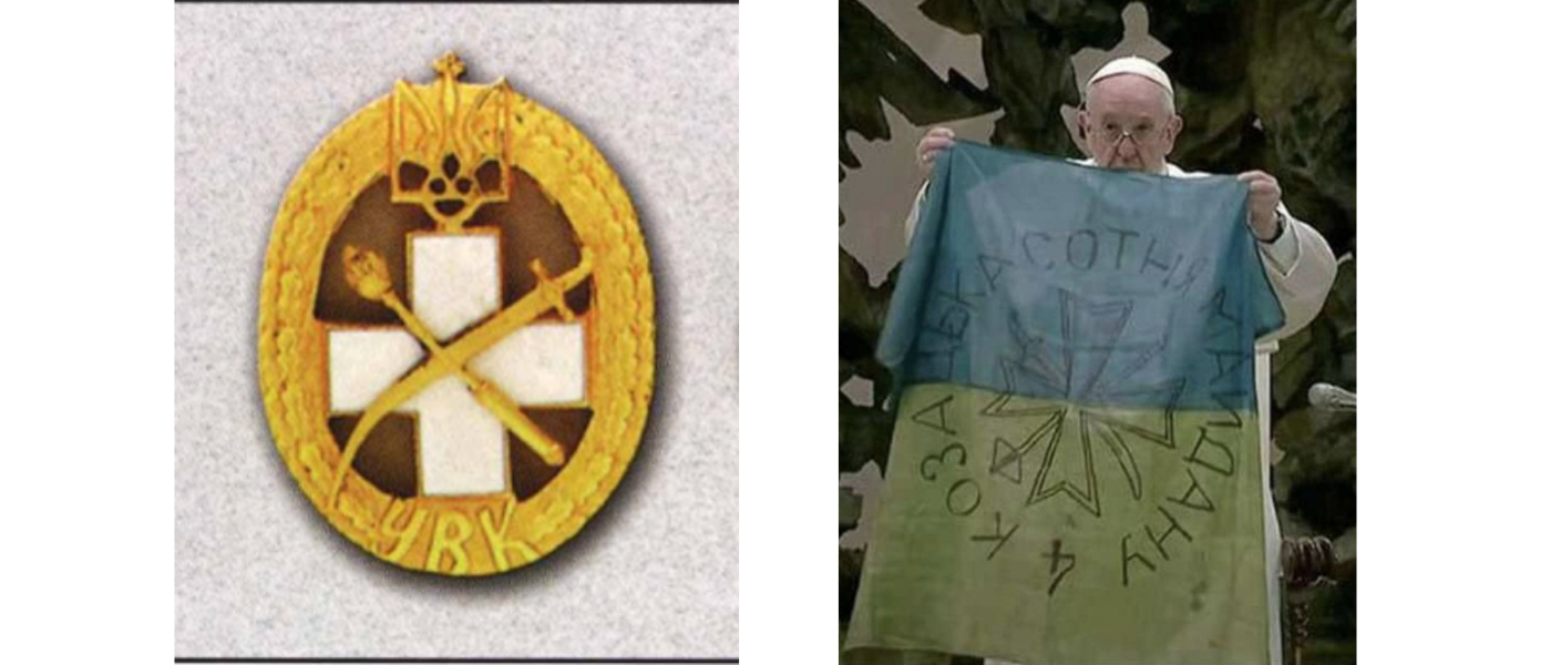 The badge has a Cossack Cross with a crossed sword and mace – a symbol identical to the one Pope Francis displays in the photo.