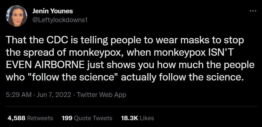 On the same day a tweet that has about 4,600 retweets and 18,000 likes implied the monkeypox virus has not been scientifically proven as airborne and criticized CDC’s advisory as not “following science.”