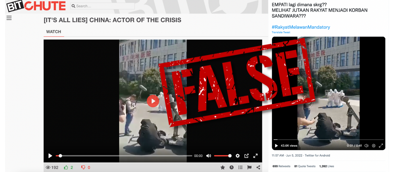 The same video has also been posted on Bitchute with the title “[IT’S ALL LIES] CHINA: ACTOR OF THE CRISIS,” along with hashtags #vaccine and #genocide. The clip was also viewed and shared across other social media platforms such as Telegram and Reddit.