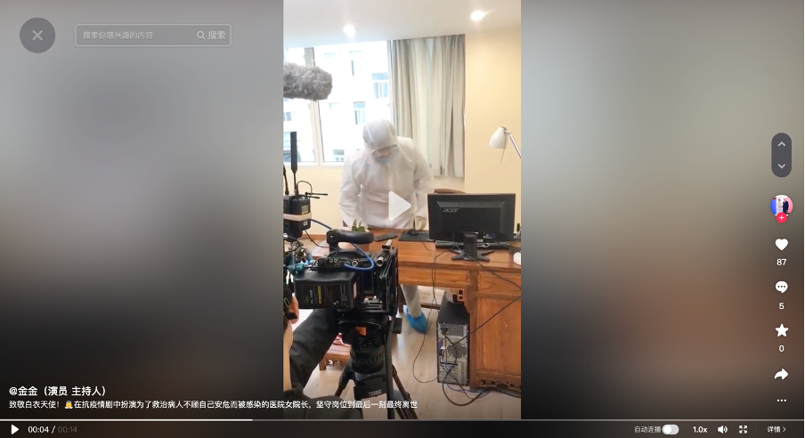 The account owner, Jin Jin (金金), described herself as one of the actors playing the role of a medical practitioner in an anti-pandemic drama.