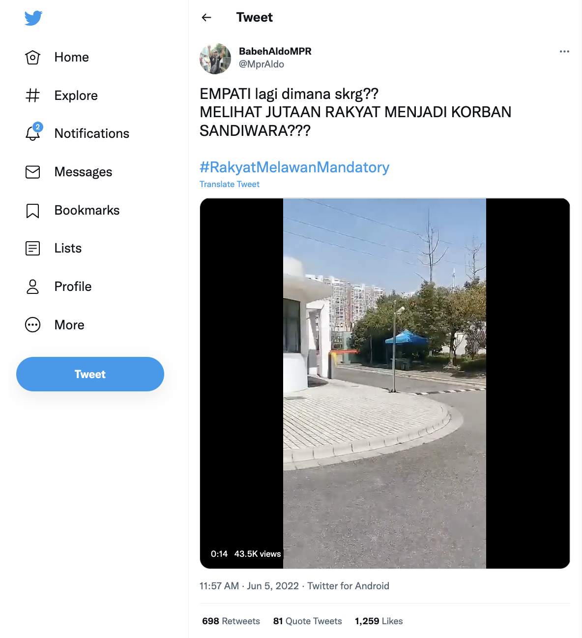 A tweet in Bahasa Indonesia shared a video in early June that shows a woman in a medical hazmat suit crying aloud and mourning over someone’s death in Mandarin Chinese in front of what appears to be a hospital.