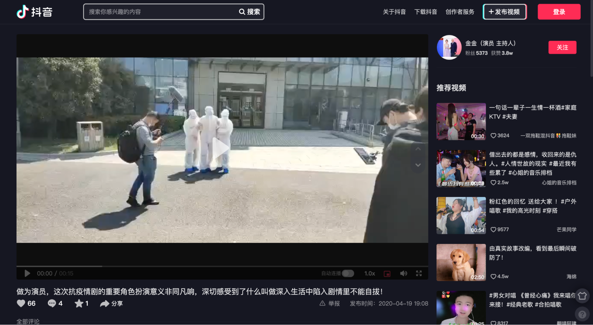Through keyword search, we found the exact same video on Douyin posted on April 19, 2020, with a Chinese caption that reads, “Wearing the full set of personal protective equipment for the whole day during the shooting and all sealed up. [I] almost couldn’t breathe. Feel deeply for the laborious work of the warriors in white.”