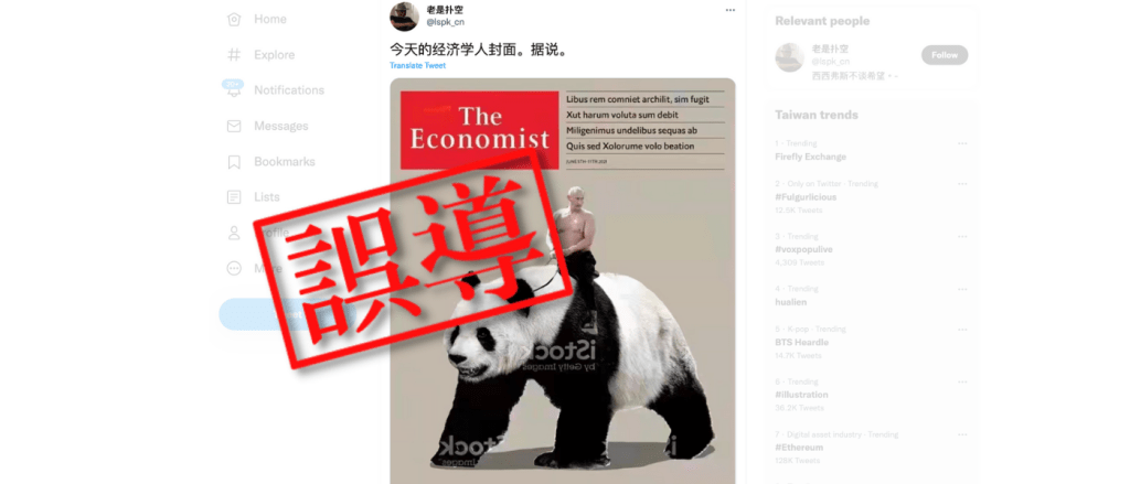 Twitter一個帖子聲稱《經濟學人》2022年3月19日出版的雜誌,封面展示俄羅斯總統普京不穿上衣騎着熊貓的畫面,影射自俄羅斯入侵烏克蘭後的中俄關係。除了這個帖子,在Twitter可以找到更多附有同一圖片的帖子,其中一個獲超過3000個讚好、700多次轉發。