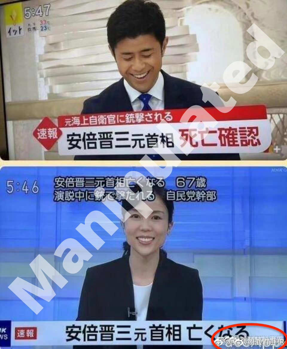 A Weibo post claimed on July 10 that many Japanese felt happy about the death of Shinzo Abe, the former prime minister of Japan who was assassinated on July 8, with images of two news anchors with a grin.