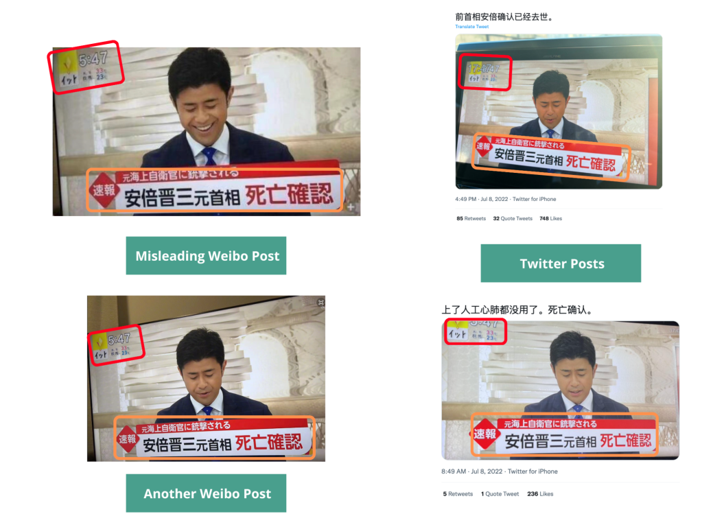 The second image shows a news anchor from another TV station, Japan’s public broadcaster NHK, also confirming the death of Abe on the same day around the same time.