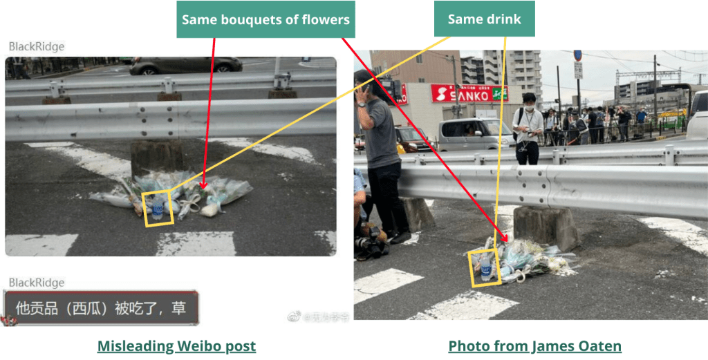 Several posts on the Chinese social media platform Weibo (here, here and here) recently claimed watermelons had been stolen from a makeshift memorial for the former Japanese Prime Minister Shinzo Abe who was assassinated in Nara on July 8.