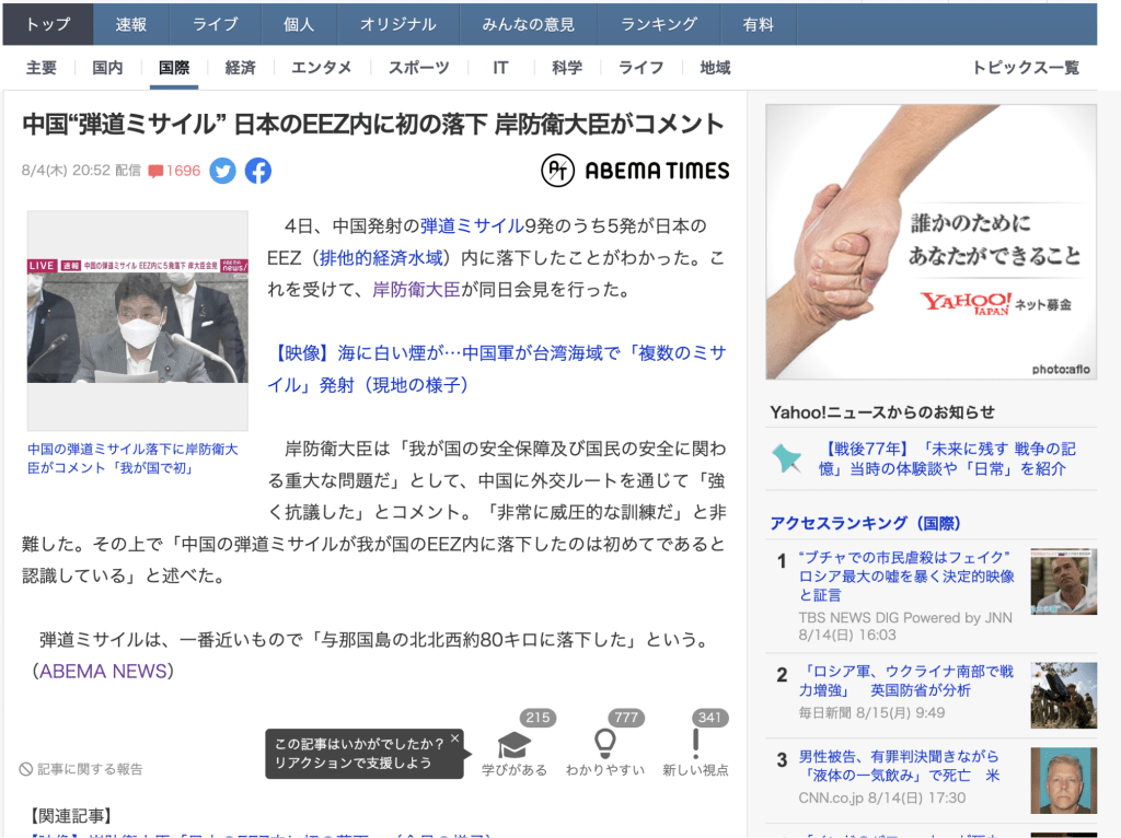 The embedded news article comes from Abema Times published on Yahoo News on Aug. 4.