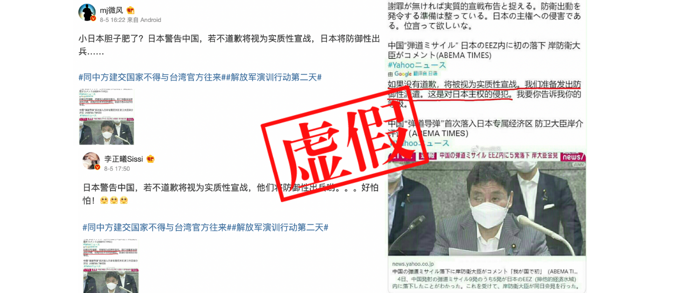 中國8月4日開始於台海地區進行一系列軍事演習,其中發射的5枚彈道導彈落入日本專屬經濟區。多名微博用戶發帖(1、2),聲稱日本警吿如果中國不就事件道歉,日本將會視之為宣戰,並作「防禦性出兵」。