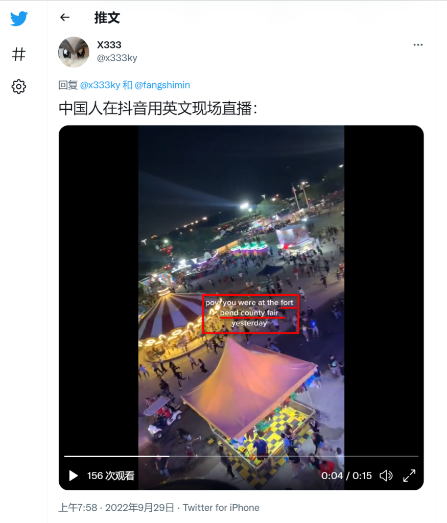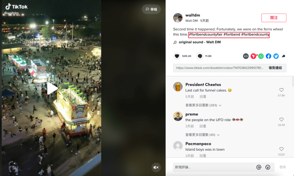 Using keyword search, we found another video clip posted on Sept. 25 on TikTok with a location hashtag #fortbendcountyfair.