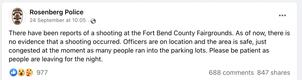The official Facebook account of the local police said on the following day that “many people ran into the parking lots,” but there was “no evidence that a shooting occurred.”