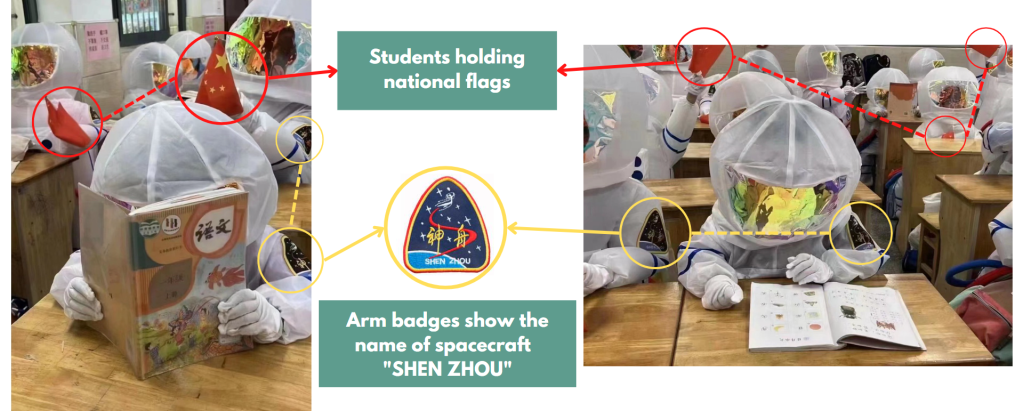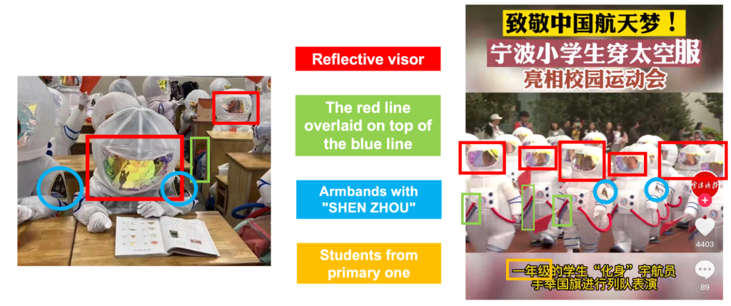Through keyword search, Annie Lab found several videos (this, this and this) about Chinese primary school students celebrating the launch of spacecraft by wearing spacesuit costumes at sporting events.