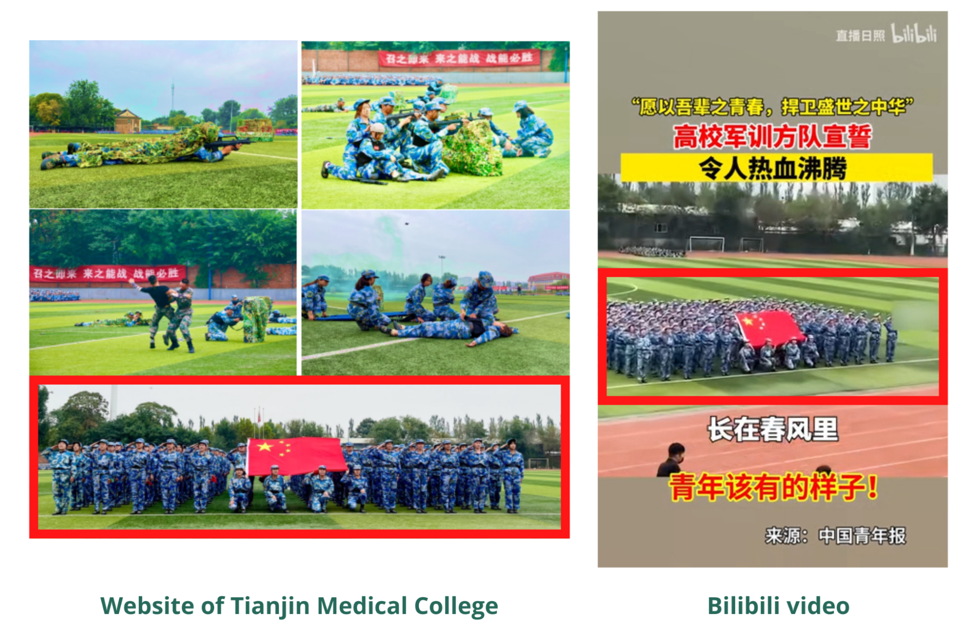Tianjin Medical College uploaded a series of photos of the 2021 military training on its website; one of them shows students in an identical formation.