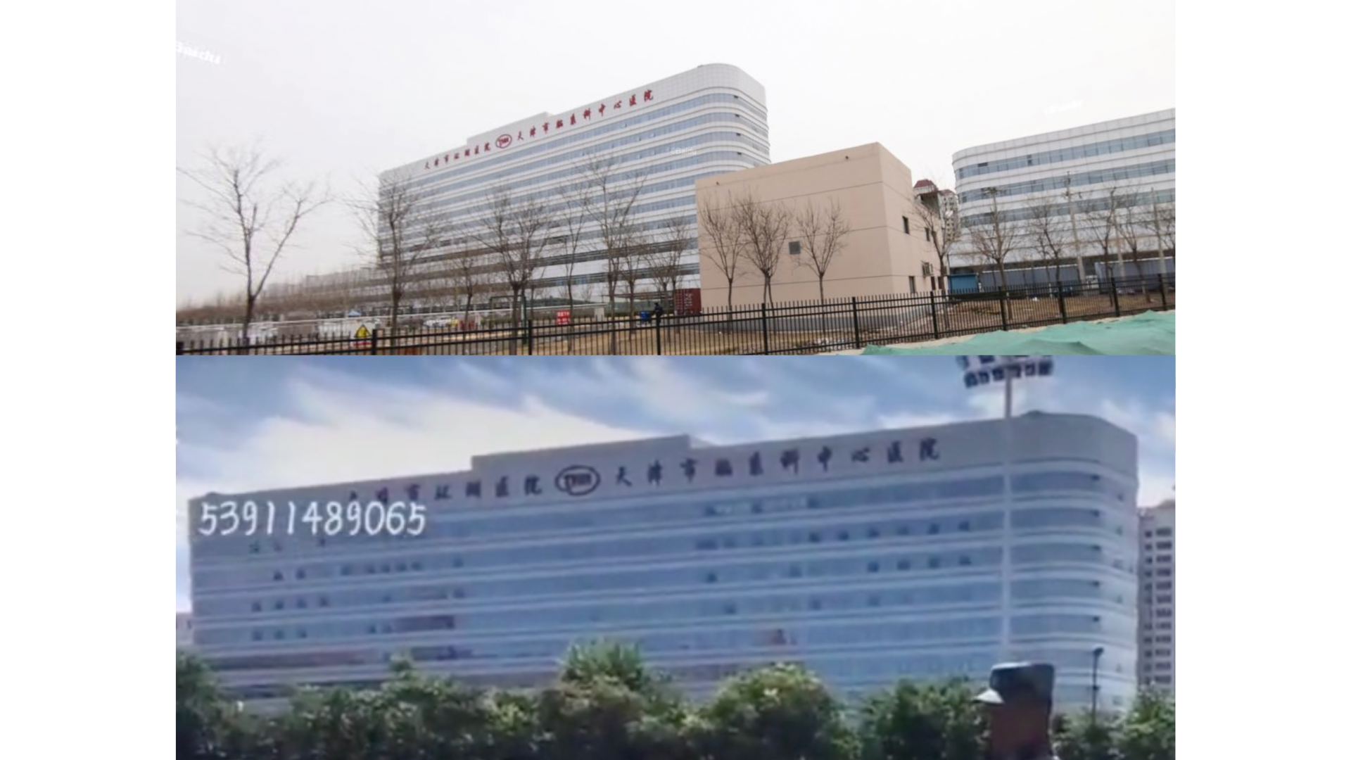 We geolocated the building seen in the background and can confirm it is the Tianjin Huanhu Hospital, also known as the Tianjin Naoxike Central Hospital near the Tianjin Medical College in the city’s Hexi district.