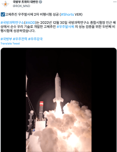 It said the Agency for Defense Development had successfully conducted the flight test of a solid-fuel space launch vehicle on Dec. 30, 2022.