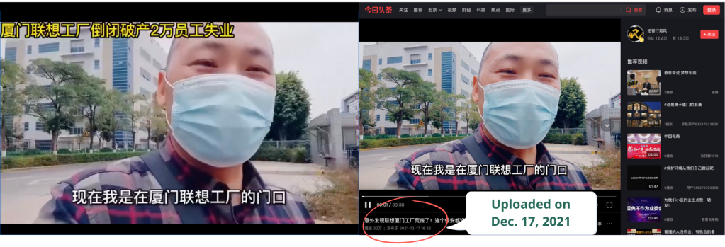 We found the same video published on Toutiao in December 2021 discussing the abandoned Xiamen Lenovo plant manufacturing mobile devices through a keyword search.