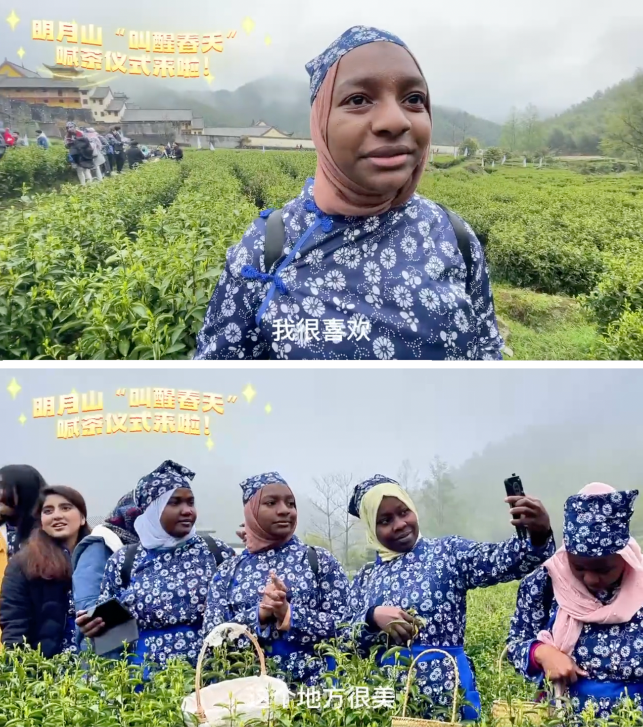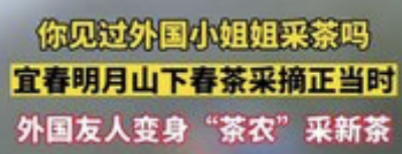 The Chinese text on the screenshot says, when translated to English, “Have you seen foreign ladies picking tea leaves? The right time [season] to harvest spring tea on the Mingyue mountain of Yichun city. Foreign friends turned into tea farmers picking tea leaves.”