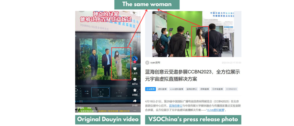 The press release by VSOChina, the company hosting the booth, featured the same woman introducing the Metaverse virtual broadcast setup.