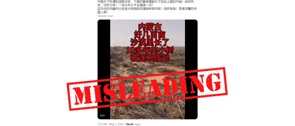 This Twitter video posted on April 30 claims that Chinese officials uprooted trees that could be used to slow down desertification in Inner Mongolia because of the so-called “return forests to farmland” policy.