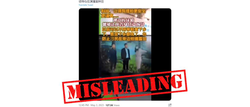 A Twitter video posted on May 3 implied that Chinese rural officials faked their rice field inspections in a studio “with a magical green box.”