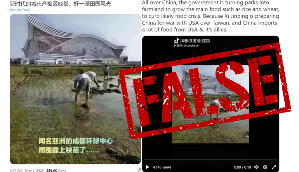 Another tweet with the same photo claimed that the Chinese government is converting parks into farmland to grow food throughout China to curb a potential food crisis “because Xi Jinping is preparing China for war with the USA over Taiwan.”